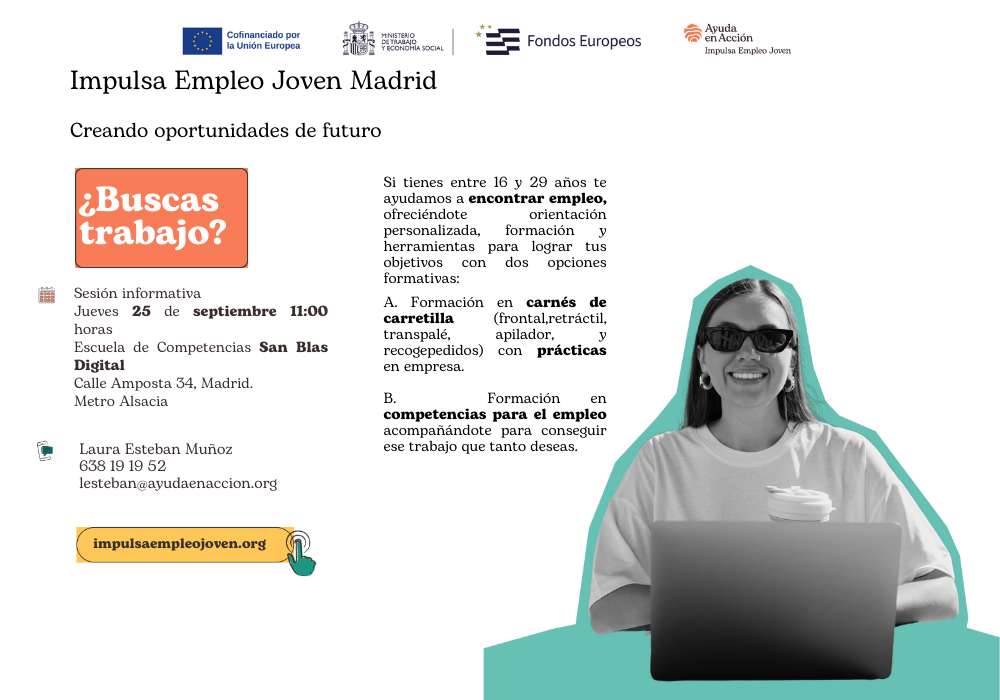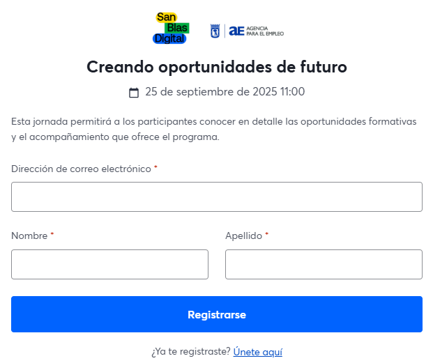 La sesión informativa tendrá lugar el jueves 25 de septiembre a las 11:00 horas en la Escuela Municipal de Competencias San Blas Digital, ubicada en Calle Amposta 34 (Metro Alsacia). Esta jornada permitirá a los participantes conocer en detalle las oportunidades formativas y el acompañamiento que ofrece el programa.