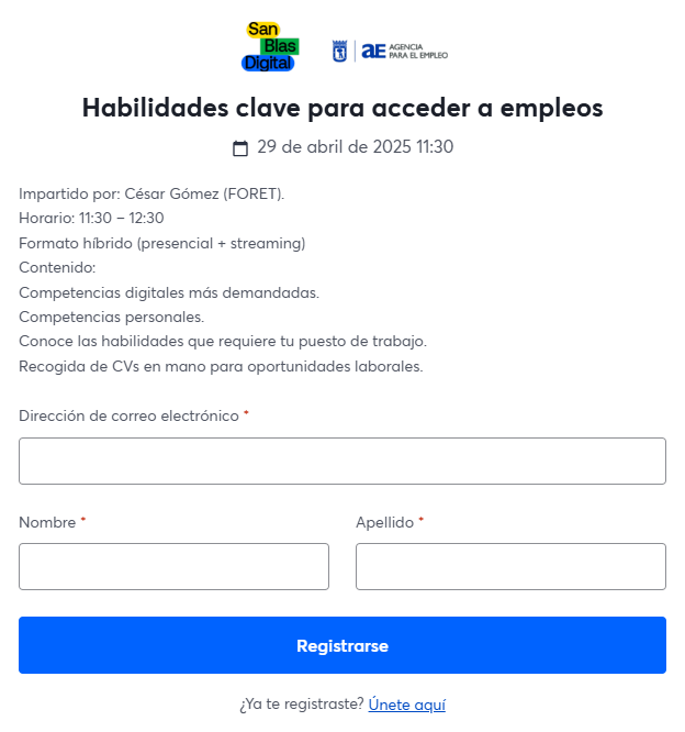 - Impartido por: Representantes de la Agencia para el Empleo y Escuela de Competencias San Blas Digital.